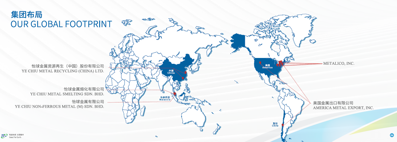 In , Ye Chiu Group established America Metal Export, Inc. in the United States, thus assuring the continuous and stable raw material supply of Ye Chiu Group. As the stable growth of its revenue, Ye Chiu (Malaysia) built the fouth plant in Tanjung Langsa Estate. Additionally, Ye Chiu (Taicang) is also enlarging its scale to make more efforts to realize the globalization objective of Ye Chiu.